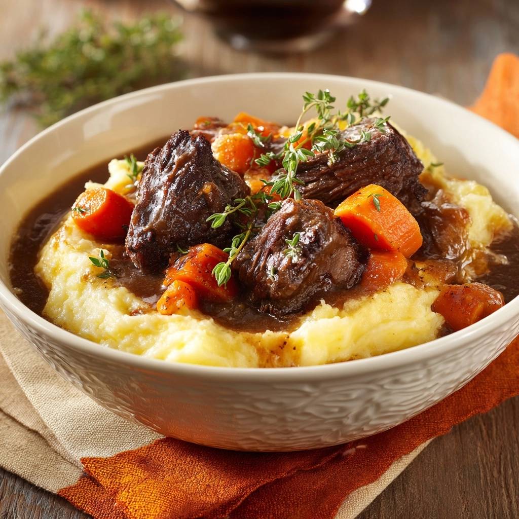 - Serve by creating a wide well of mashed potatoes in a shallow bowl. Spoon the beef, carrots, and plenty of the dark reduction into the center. Garnish with fresh thyme sprigs as shown in the image.