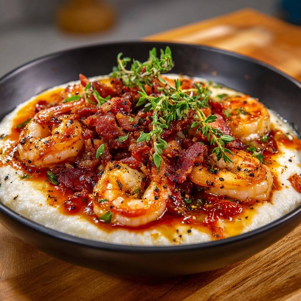 Arrange the shrimp neatly in the center of the well. Sprinkle the crispy bacon bits over the top for texture. Finally, drizzle that amber pan sauce over the shrimp and let it bleed into the white grits. The color contrast is stunning. Garnish with a few fresh thyme sprigs to add a pop of green and a fresh herbal aroma that hits the diner before the first bite.