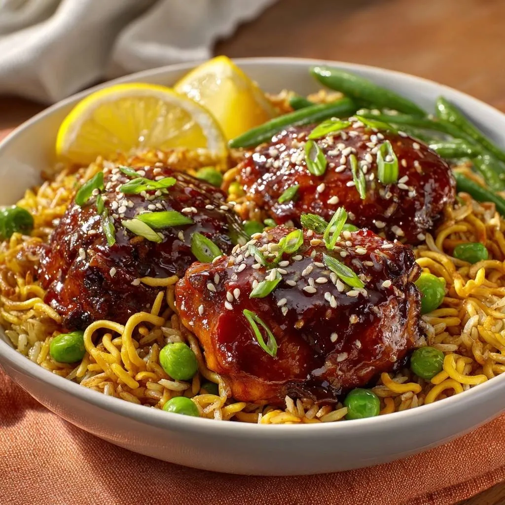 - Arrange the glazed chicken over the noodles. Garnish with sesame seeds, sliced green onions, and lemon wedges for a bright acidic finish.