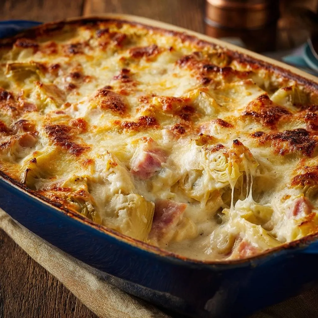 This Cheesy Artichoke and Ham Casserole is the solution to that soggy problem. We’re combining the salty, smoky punch of thick-cut ham with the earthy, tender bite of artichoke hearts. It’s a rich, savory experience that feels like a warm hug on a plate, but with a structural integrity that stays creamy from the first scoop to the last.
