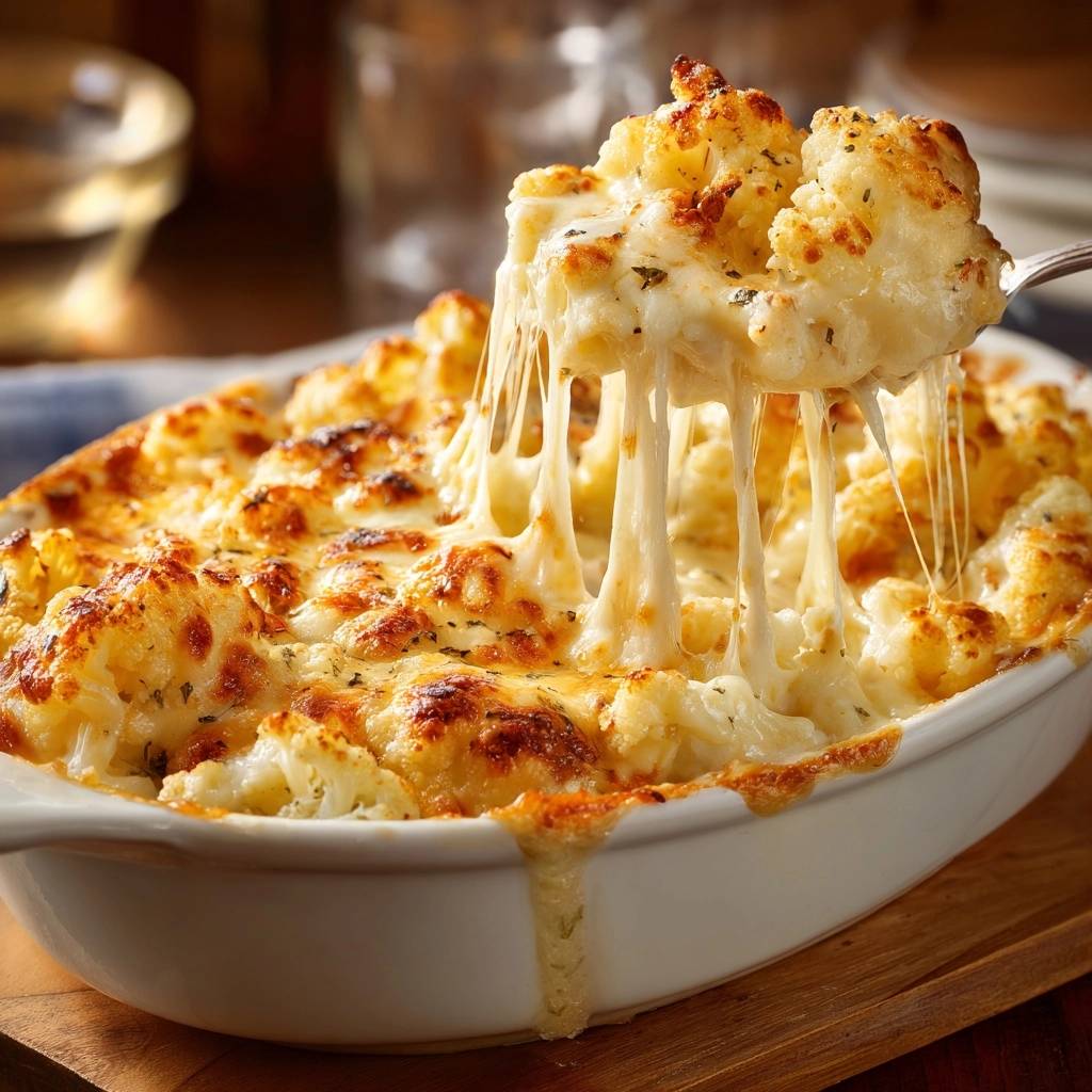 Store leftovers in an airtight container in the refrigerator for up to 3 days. To reheat, place the cauliflower in an oven-safe dish and bake at 350°F for 10-15 minutes until the cheese is bubbly again. Avoid the microwave if possible, as it tends to make the cauliflower rubbery and the cheese oily. This dish does not freeze well because the cream sauce will separate when thawed.