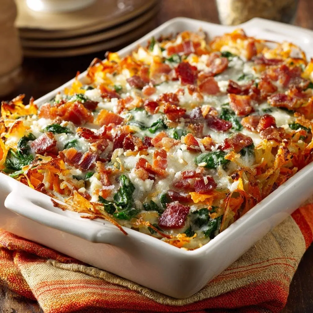Absolutely! Simply omit the beef or turkey bacon. To keep that smoky flavor profile, you can add a teaspoon of smoked paprika to the cream sauce or top the casserole with some smoked provolone cheese along with the mozzarella. You could also add sautéed mushrooms or sun-dried tomatoes to provide a meaty texture without using animal protein.