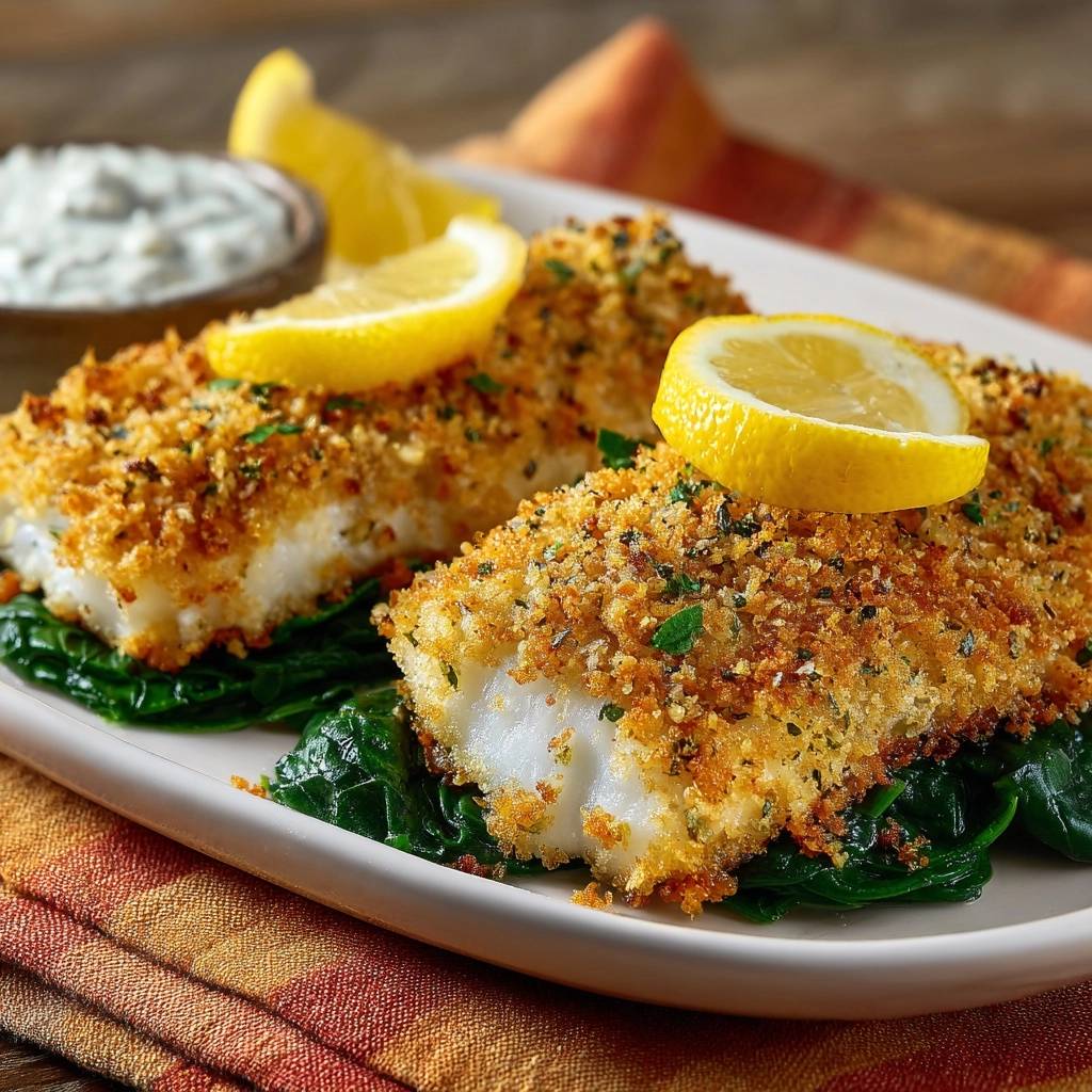 - Lightly steam or sauté the spinach for 30 seconds just until wilted, then arrange it as a bed on the plate. Place the fish over the spinach, garnish with fresh parsley and lemon wedges, and serve with a side of tartar sauce.