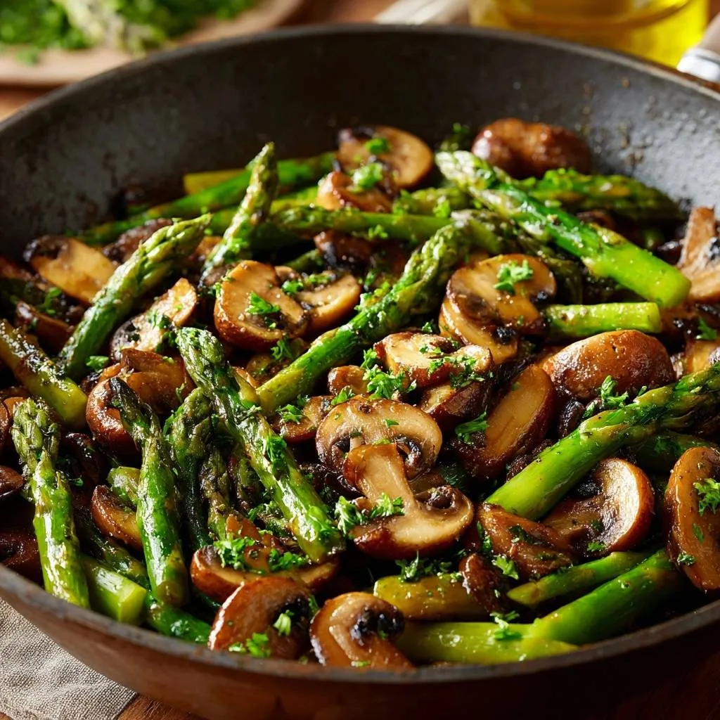 The process is divided into three distinct stages: the mushroom sear, the asparagus snap, and the aromatic finish. By staggering the entry of the ingredients, you respect the different cooking times of each vegetable, ensuring nothing ends up overcooked or under-seasoned.