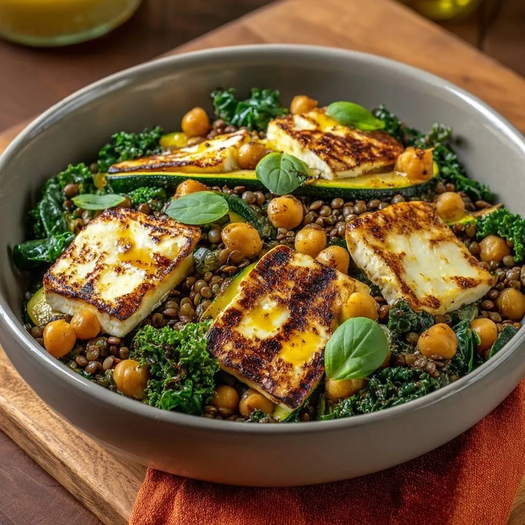 - Assemble: Divide the lentil and kale base between two bowls. Arrange the charred zucchini and the hot halloumi slices on top.