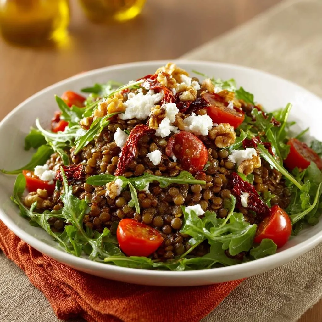Texture is further enhanced by using two types of tomatoes. Fresh cherry tomatoes provide a juicy, sweet burst, while julienned sun-dried tomatoes offer a concentrated umami punch. These sun-dried bits act like little flavor bombs, providing a chewy contrast to the crunch of the walnuts and the softness of the lentils.