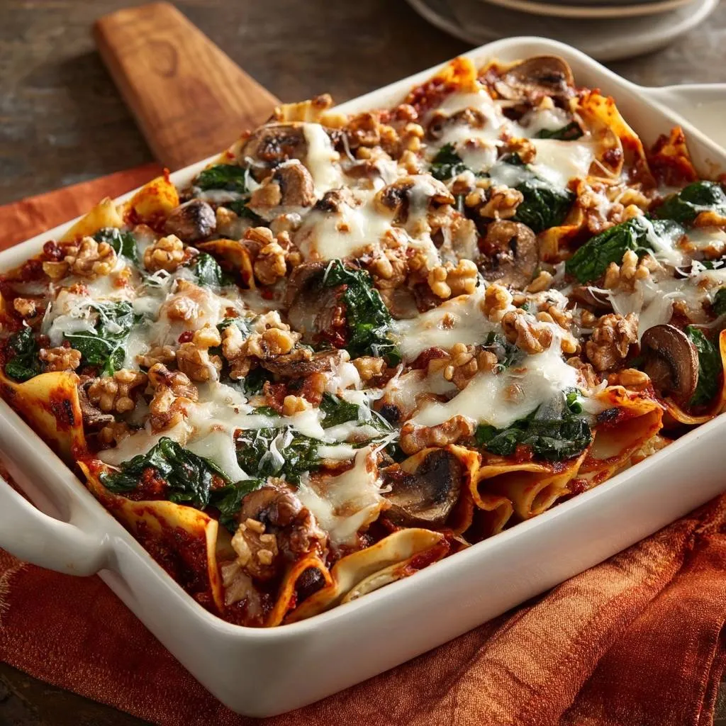 To make your lasagna look as good as it tastes, reserve a small handful of the sautéed mushrooms, spinach, and walnuts before you start layering. Scatter these over the top layer of cheese before it goes into the oven. While the interior ingredients stay moist and tender, these surface toppings will roast in the dry heat, becoming crispy and intensely flavorful. It gives the dish a rustic, artisanal look that screams “homemade.”
