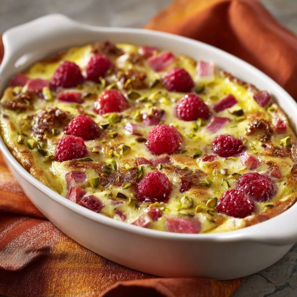 This bake stays firm and delicious for about 3 days in the refrigerator. Keep it covered with plastic wrap or in an airtight container. Note that the pistachios will lose their crunch over time as they absorb moisture from the custard, so you might want to add a fresh sprinkle when serving leftovers.