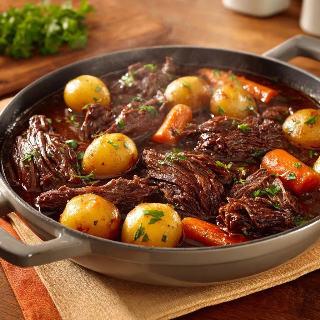 Imagine pulling a heavy Dutch oven from the stove and lifting the lid to reveal a deep, mahogany sauce bubbling around massive, ropey strands of beef. The aroma hits you first—a heady mix of earthy thyme, sharp garlic, and the complex sweetness of a reduced red wine base. Unlike standard stews where the vegetables have surrendered into a grainy mush, this version showcases vibrant carrots and intact baby potatoes that hold their shape perfectly against the fork-tender meat.