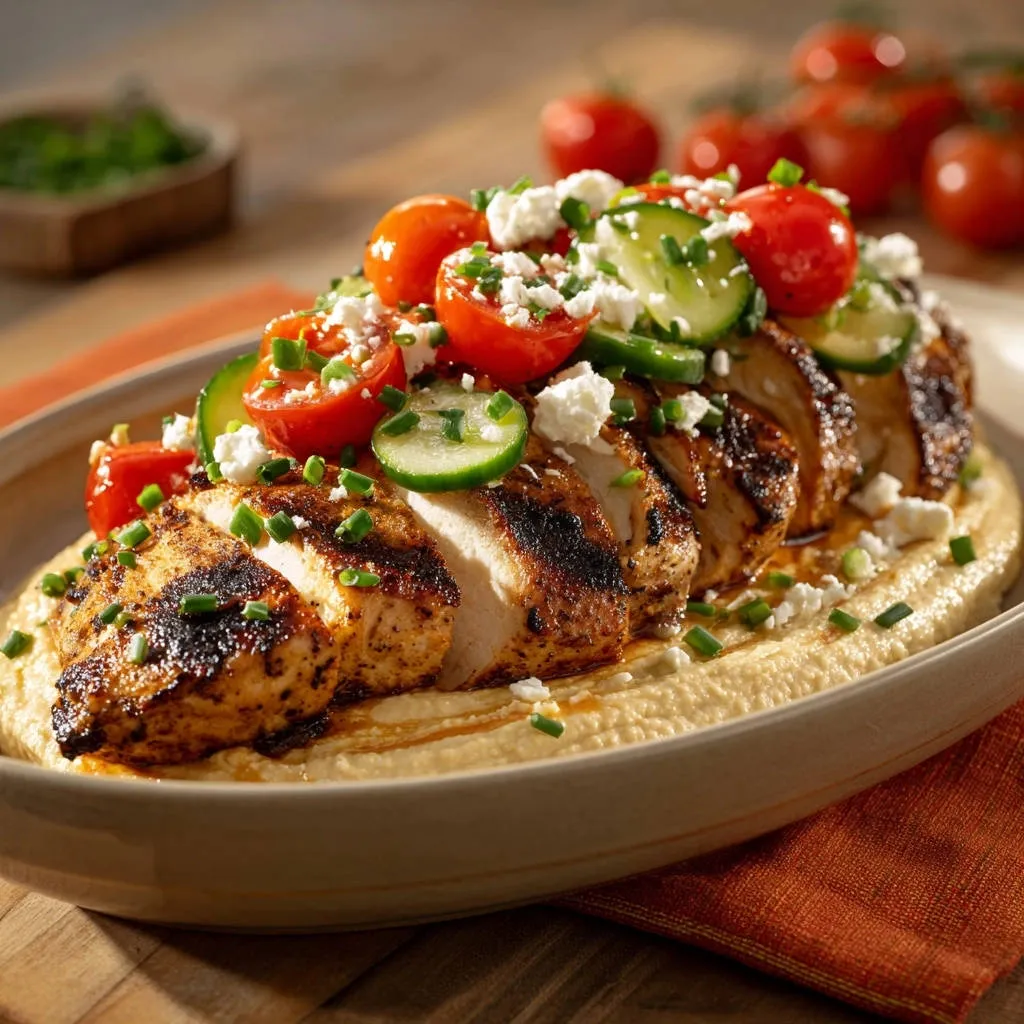 - Slice the rested chicken: Slice the chicken breasts against the grain into thick pieces. Arrange the sliced chicken over the hummus.
