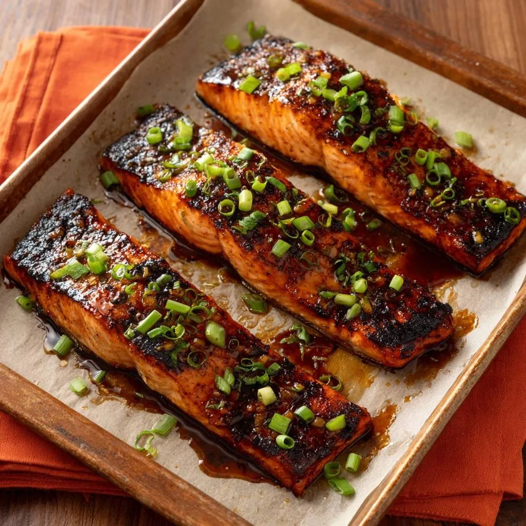 - Sprinkle with sliced green onions. Rest 2 minutes before serving. The skin-side-down parchment method locks in juices during baking, while the end-glaze broil adds perfect sticky shine without drying out the salmon. Serve with rice or veggies.