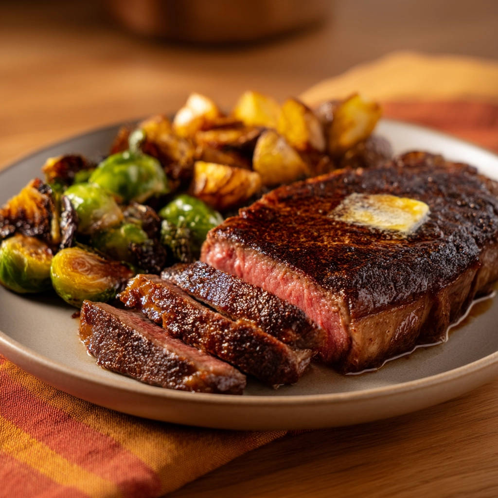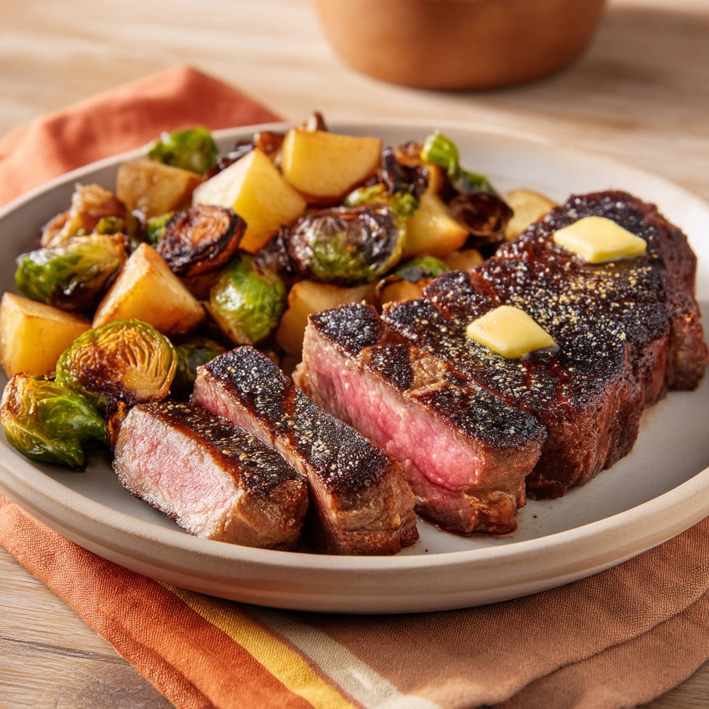 7. Rest and Serve: Transfer the steaks to a cutting board. Top with the butter. Let the steaks rest for at least 5-10 minutes before slicing. This resting period is crucial for juicy steak! During this time, the juices redistribute throughout the steak, resulting in a more tender and flavorful bite. Serve the sliced steak alongside the roasted brussels sprouts and potatoes.
