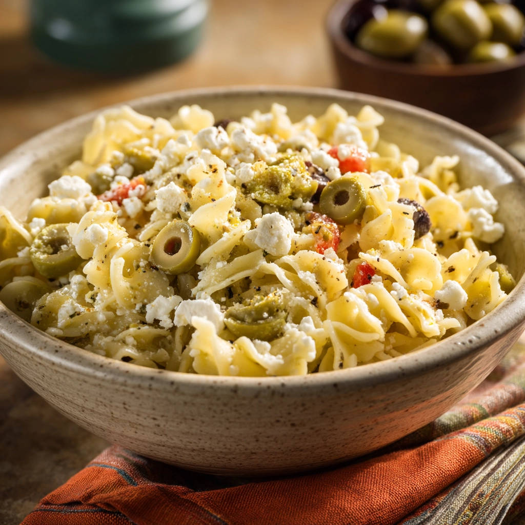 - In a large bowl, combine the drained pasta, green olives, cubed feta cheese, and diced red bell pepper.