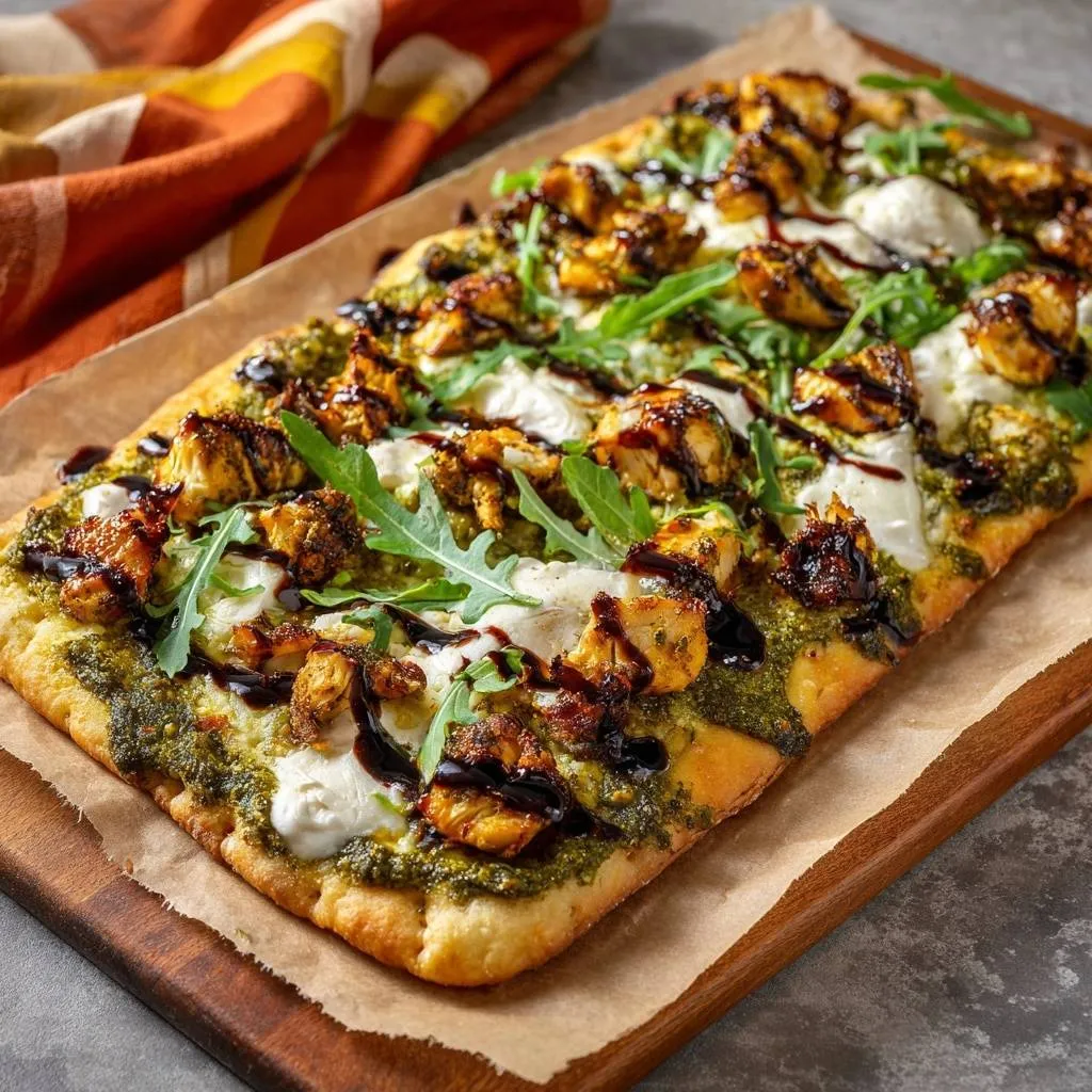 Ever bite into a pesto chicken flatbread only to chew through dry, rubbery chicken that ruins the whole thing? This pesto chicken flatbread fixes that frustration fast. You get juicy, charred chicken chunks seared over high heat, locking in moisture before a quick bake. In addition, the crispy flatbread base pairs perfectly with creamy burrata, peppery arugula, and a sweet balsamic drizzle.
