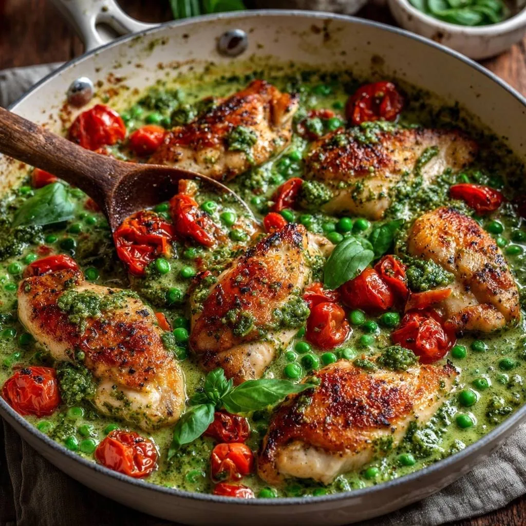 Pesto Chicken Thighs with Peas & Sun-Dried Tomatoes