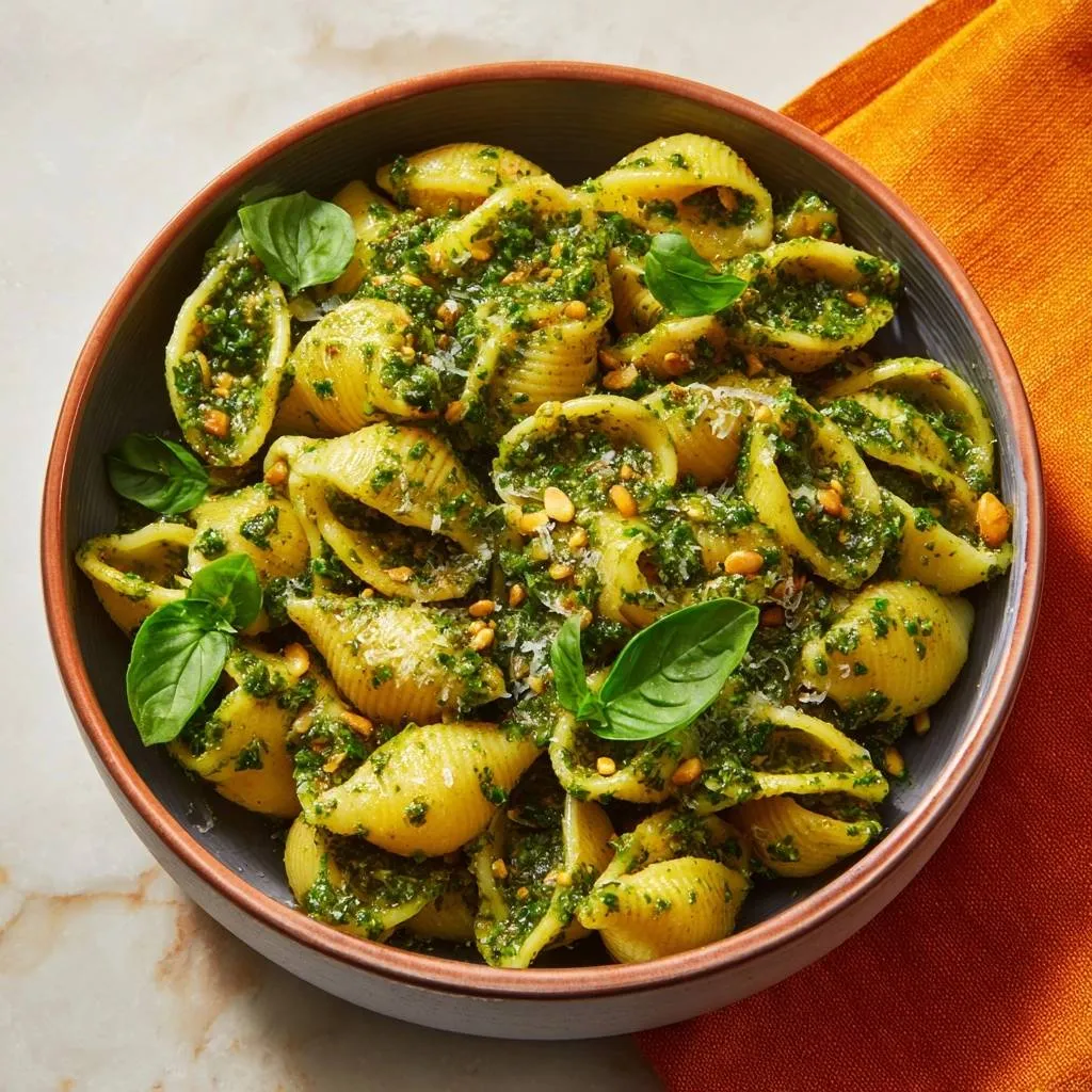 Mix 1 cup basil with 1 cup arugula or spinach for peppery depth. Arugula adds bite, spinach mellows with nutrition. Both shift color to pretty green hues in pesto shell pasta.