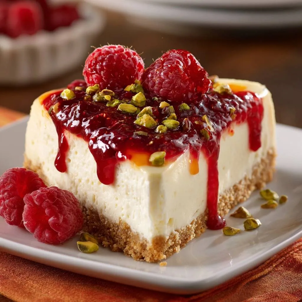 - Run knife around cheesecake edge, release from pan. Spoon raspberry topping over slices, sprinkle with chopped pistachios. Slice and serve chilled.