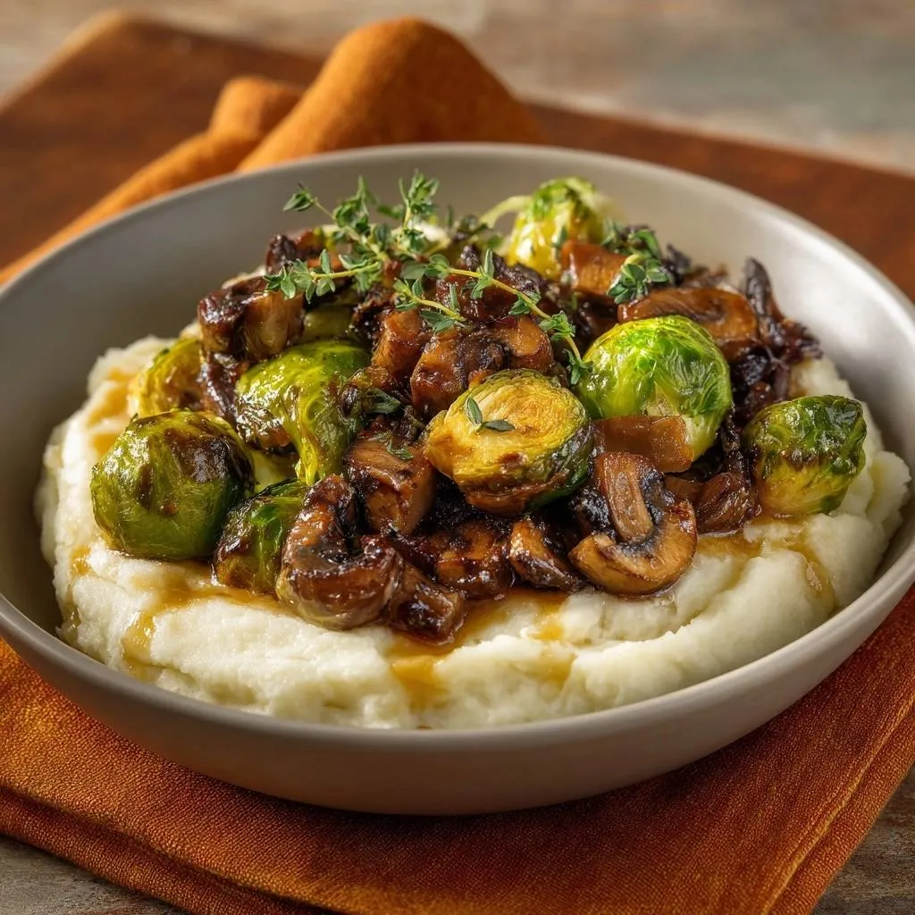 Flavor Twists on Roasted Brussels Sprouts and Mushrooms over Creamy Mash