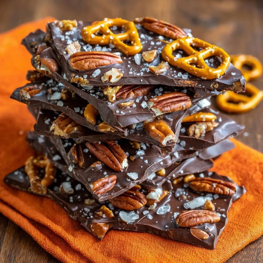 Dark chocolate provides snap and deep flavor from 60-70% cocoa solids. Pretzel twists offer alkaline crunch that holds up better than sticks. Toasted pecans add nutty depth, and flaky sea salt balances the sweetness perfectly.