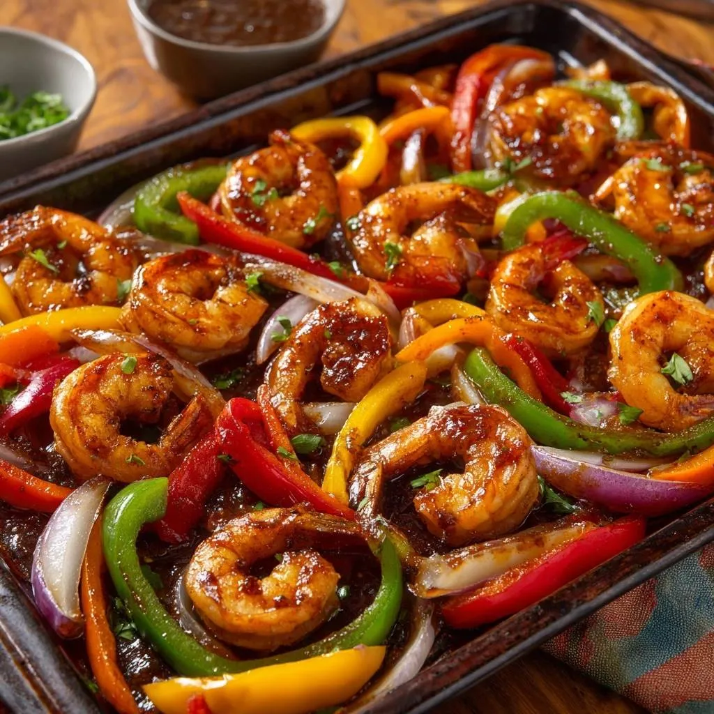 You’ll need 1 lb large shrimp, peeled and deveined. Large ones cook evenly without turning tough, so they stay plump under that quick roast. In addition, grab 3 bell peppers, one red, one green, one yellow, sliced into strips, plus a large red onion in wedges.