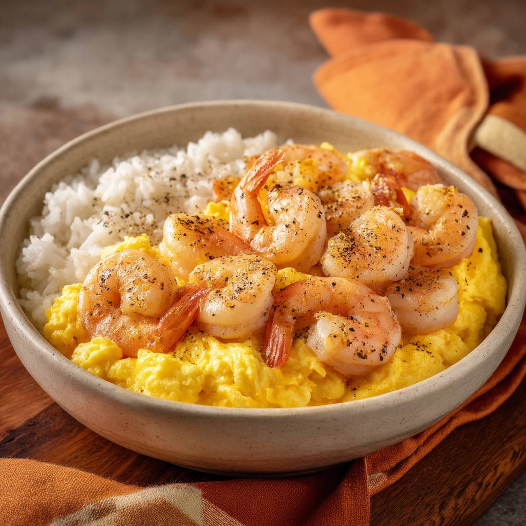 - Time to build your masterpiece! Divide the warm, cooked white rice evenly between two bowls. Spoon those gorgeous, fluffy scrambled eggs right next to the rice in each bowl. Pile the perfectly cooked, seasoned shrimp on top of the eggs and rice. If you’re like me, finish it off with an extra sprinkle of freshly ground black pepper. Serve immediately and enjoy the fruits of your labor!