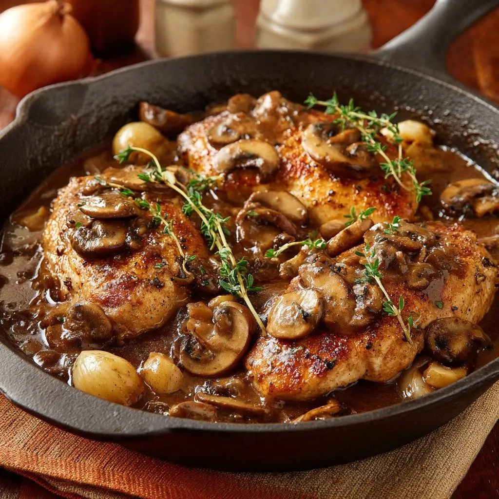 Swap chicken for thick tofu slabs or portobello cutlets. Sear same way, simmer shorter. Double mushrooms for heartier texture and protein.