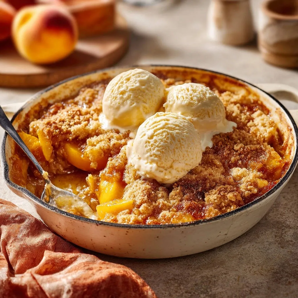 Vanilla Ice Cream: The classic, creamy contrast that melts into the warm Skillet Peach Crumble, making each bite truly heavenly.