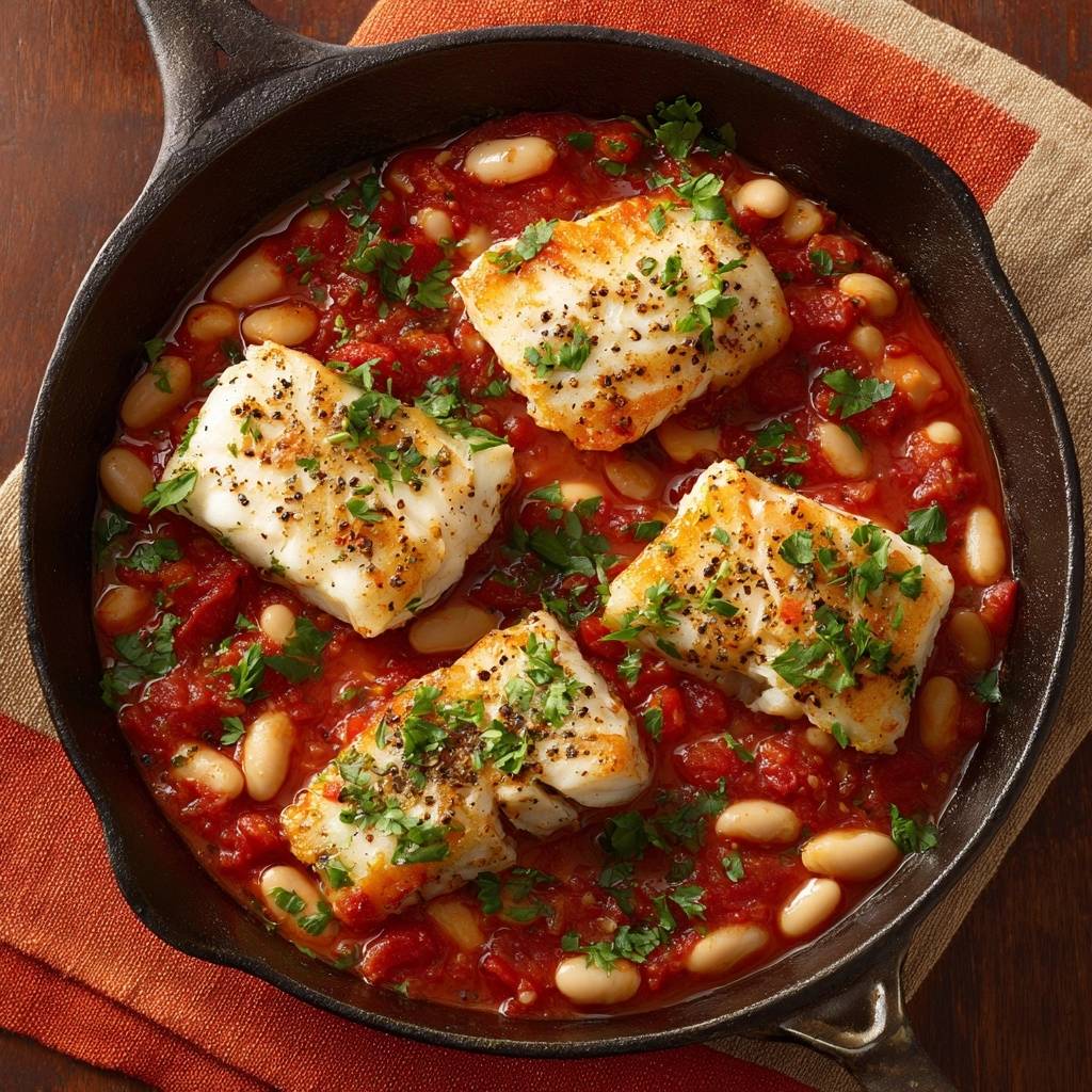 By searing the fillets over high heat for just a few minutes, we trigger the Maillard reaction for flavor without cooking the center. Then, we move to a gentle poach. Nestling the fish on top of the bean mixture allows the steam from the tomatoes to finish the interior of the cod. This indirect heat is much more forgiving and keeps the fish succulent and pearly white inside.