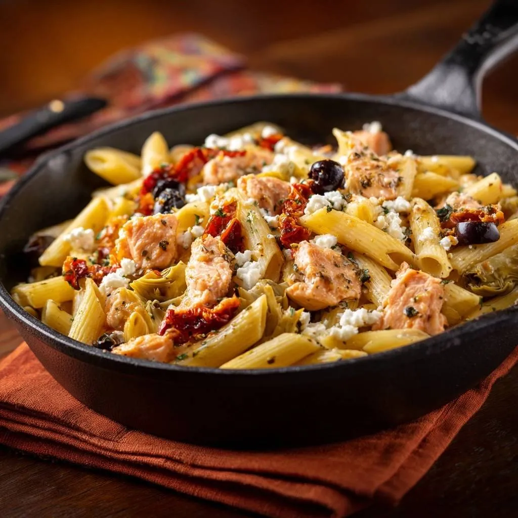 Skillet Salmon Penne with Sun-Dried Tomatoes, Olives & Feta