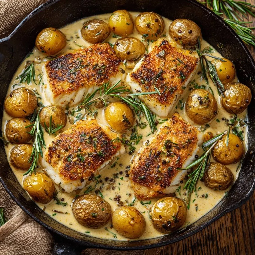 Skillet-Seared Cod with Baby Potatoes and Rosemary Cream Sauce