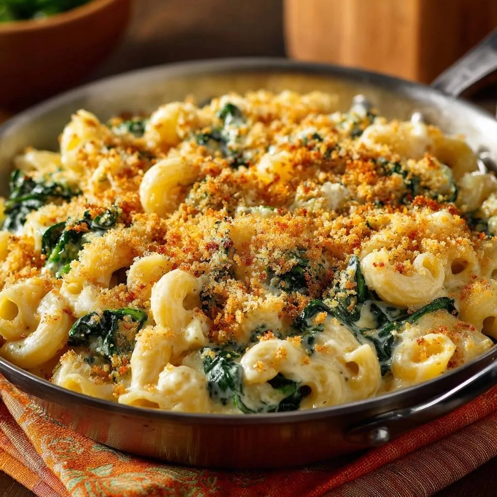 Crispy Breadcrumb Topping on Skillet Spinach Mac and Cheese