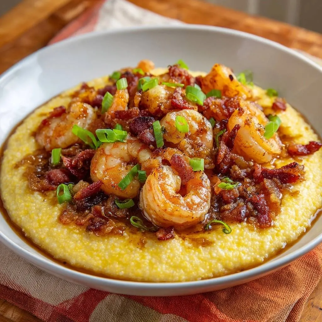 Spoon hot creamy grits into bowls. Layer saucy shrimp on top, then scatter crispy bacon and green onions. Serve immediately so textures shine in your Southern shrimp and grits.