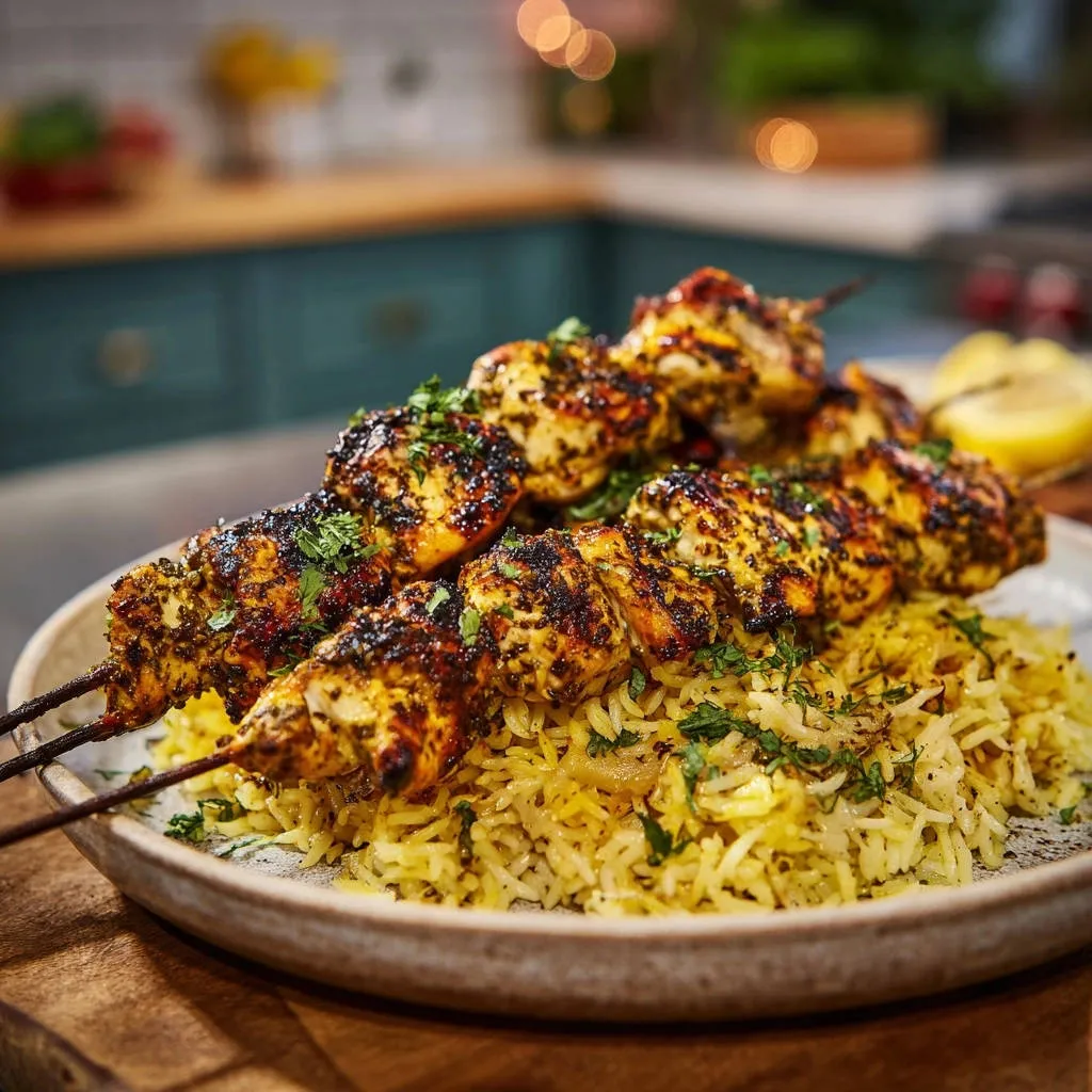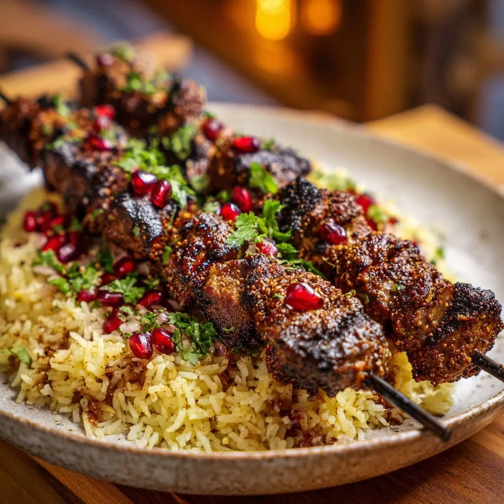 - To serve, arrange the cooked skewers over the fluffy rice. Garnish generously with fresh chopped parsley or cilantro and pomegranate seeds. Drizzle with pomegranate molasses or a dark glaze if desired. Enjoy your perfectly juicy skewers!