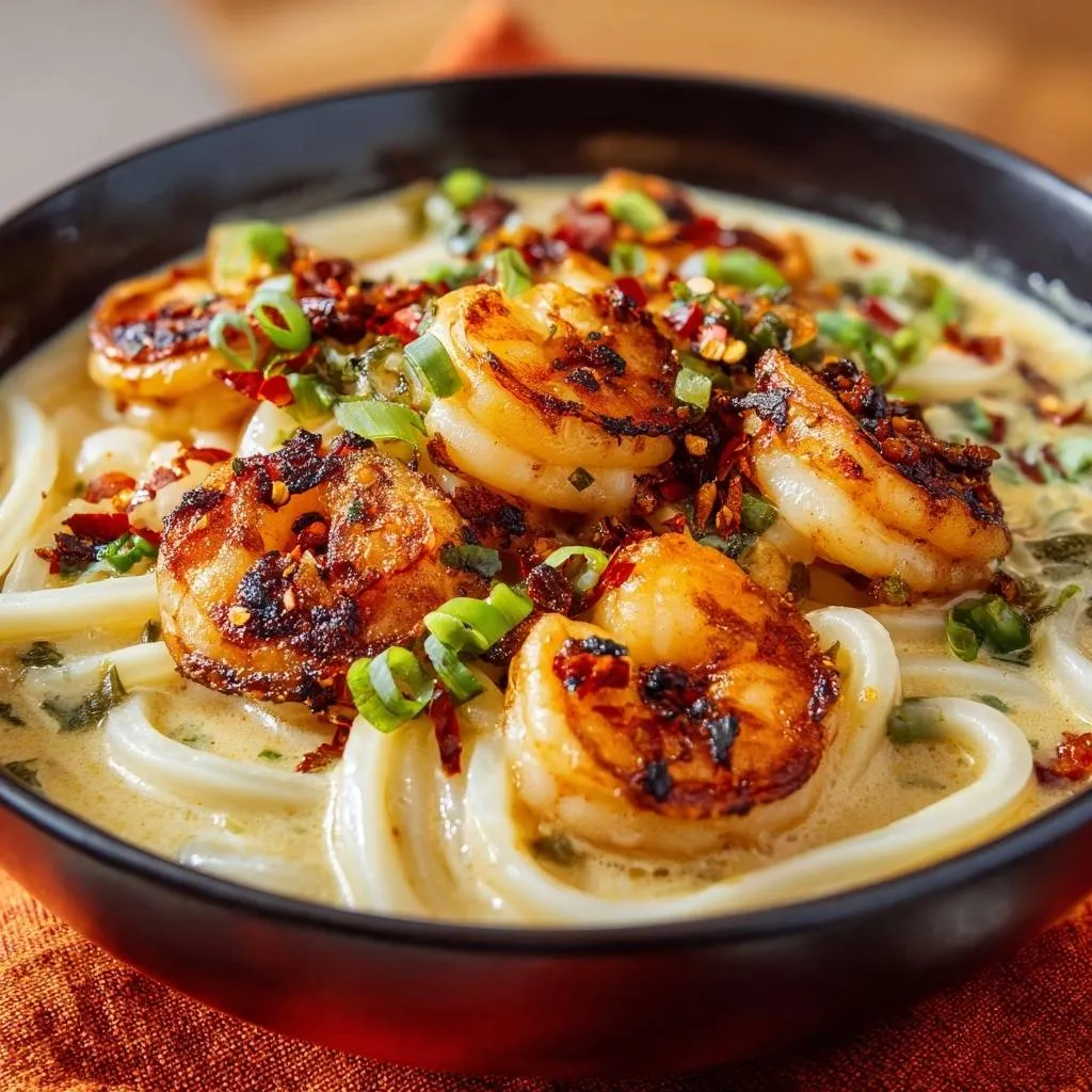 Serve immediately into bowls for peak tenderness. Top with crispy garlic and green onions. Your Spicy Creamy Shrimp and Squid Udon shines.