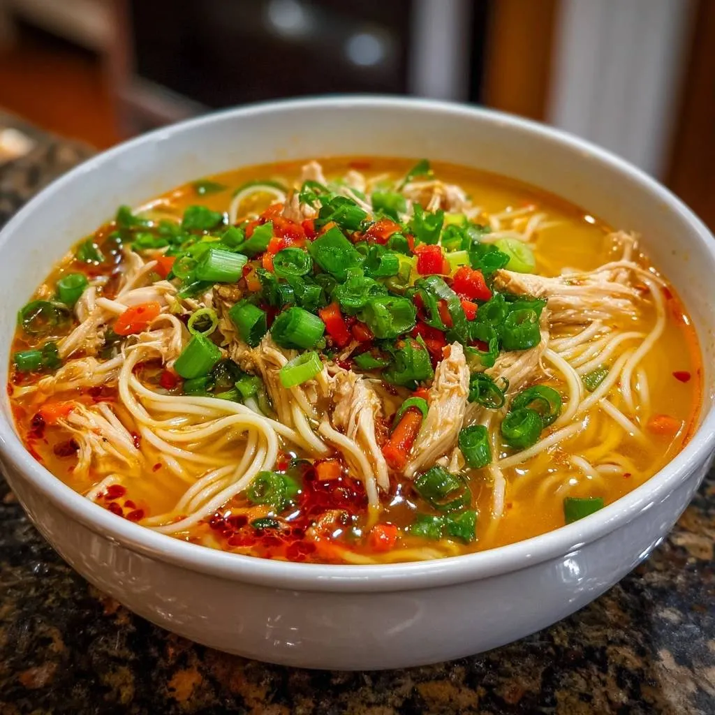 Drizzle extra chili oil after ladling for personalized heat. Keep green onions raw for crunch against the warm broth. In Spicy Shredded Chicken Ramen, this layering makes every bite exciting.