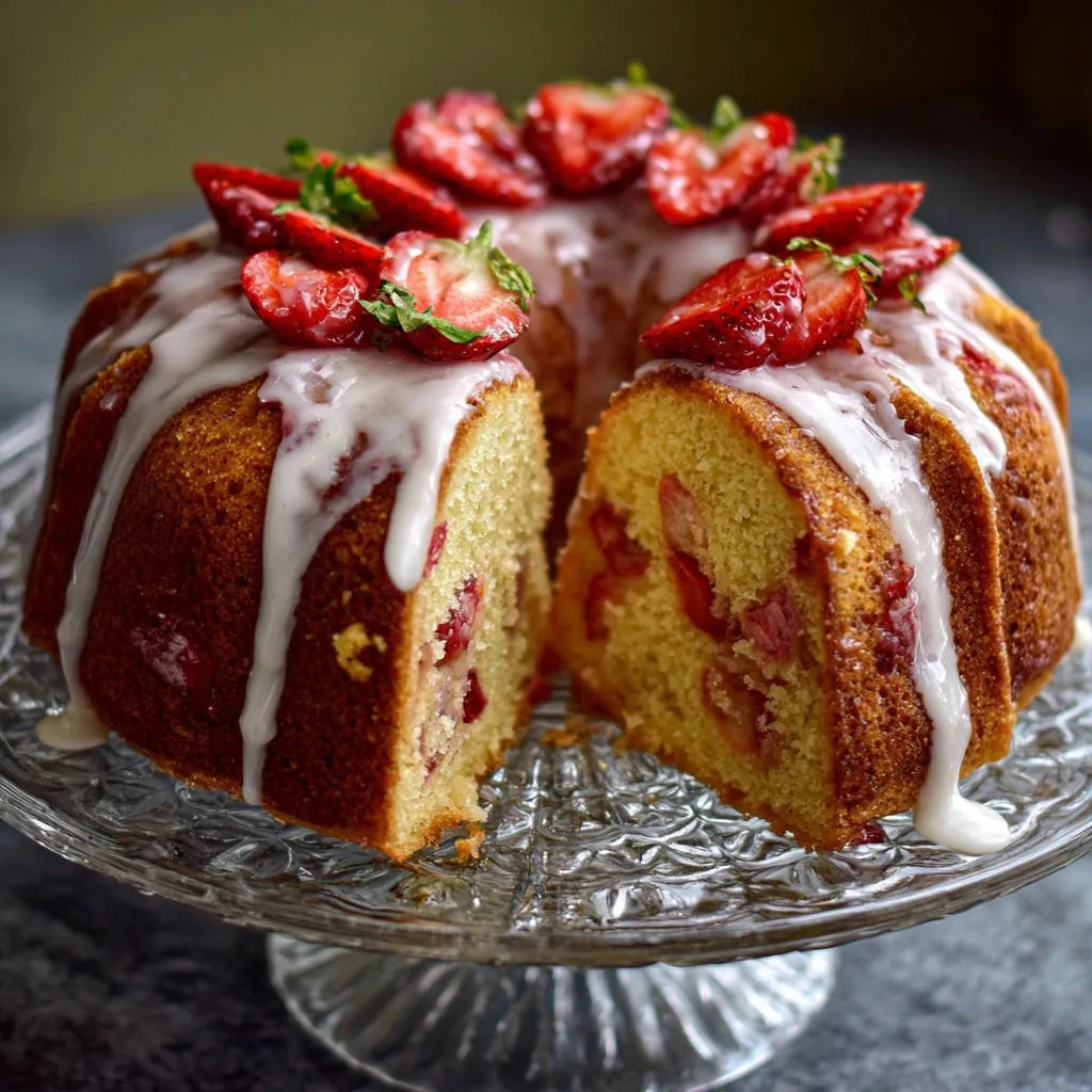 - Once the cake is completely cool, drizzle the glaze over the top, letting it run down the sides. Garnish with fresh strawberries before serving.