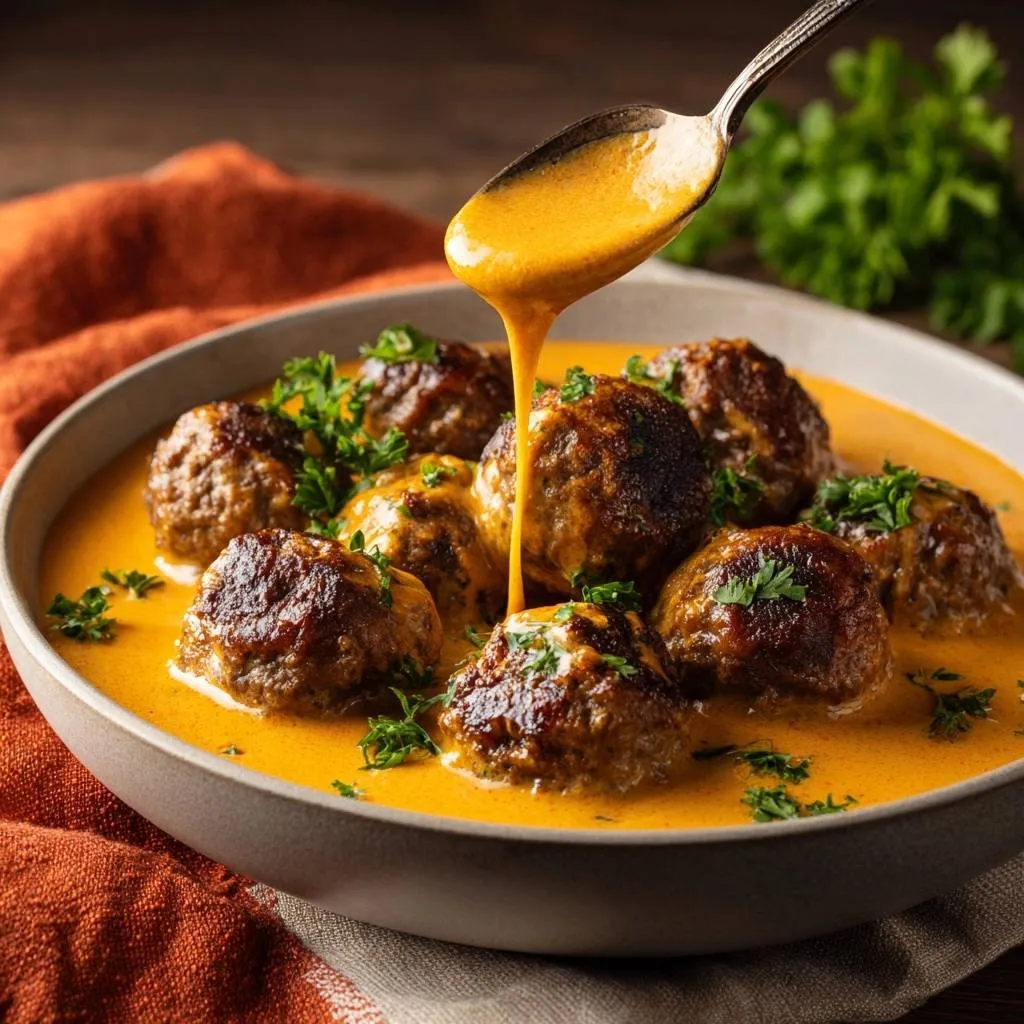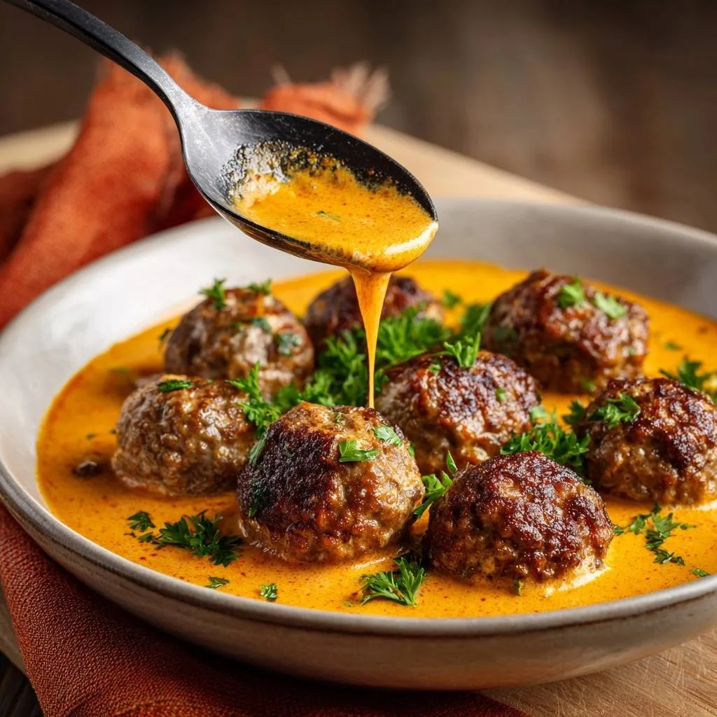 Traditional gravies were pale, but tomato paste became a modern addition for vibrant orange color and depth. Scandinavian regions vary it slightly, some adding more mustard. It clings beautifully to the meatballs.