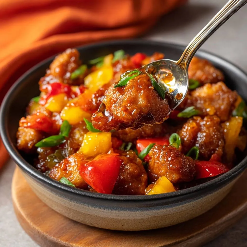 Tri-color bell peppers (1 red, 1 green, 1 yellow, chopped) bring crunch, color, and mild sweetness. They contrast the sauce perfectly. Fresh pineapple chunks (2 cups) win over canned for juicier pop; drain if watery.