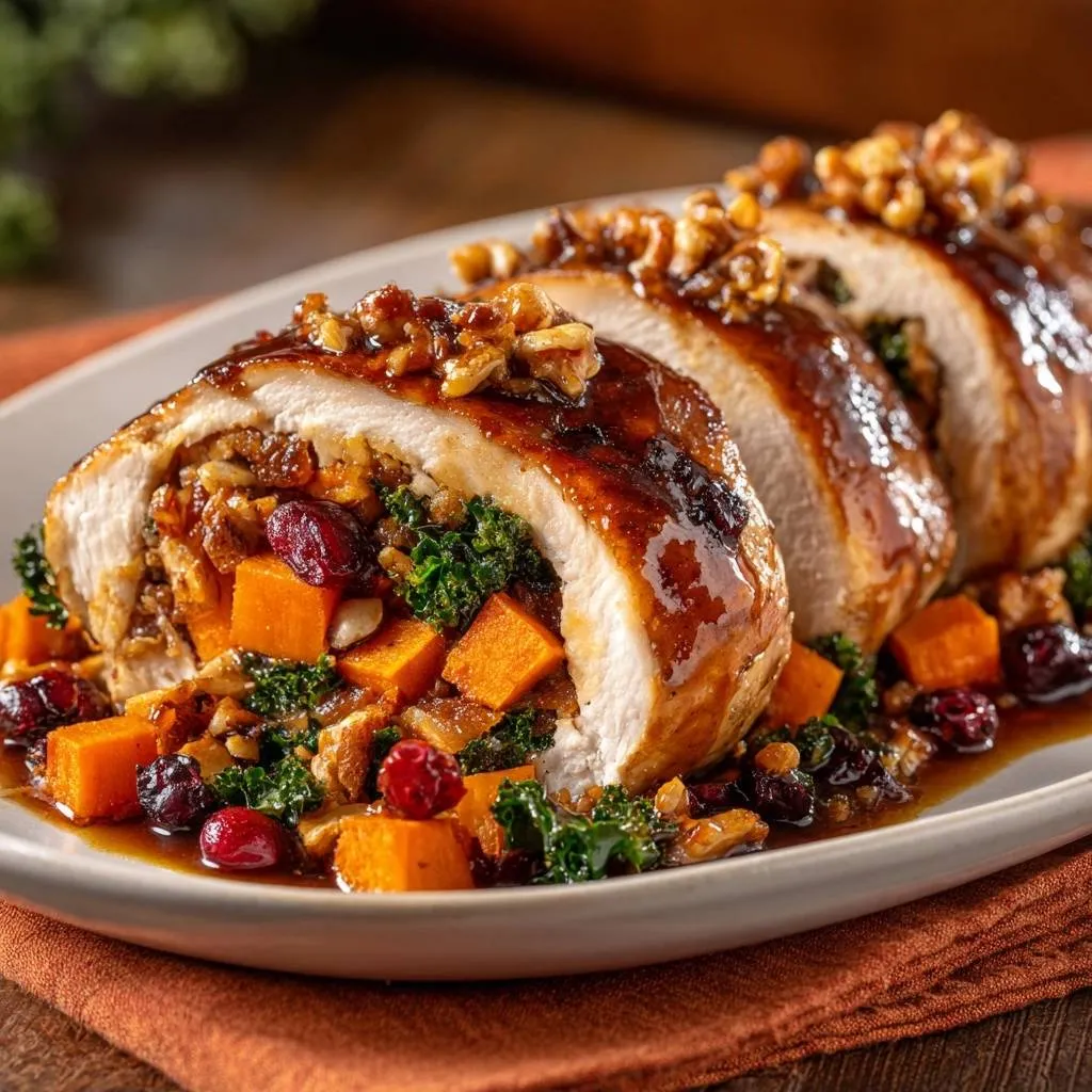 For the glaze, mix 1/4 cup balsamic vinegar, 2 tablespoons honey, and 1/4 cup fresh cranberries, plus 1 tablespoon chopped walnuts for garnish. These create balance: sweet potatoes soften without mush, kale wilts tenderly, and cranberries add chew in the cranberry chicken roulade filling.