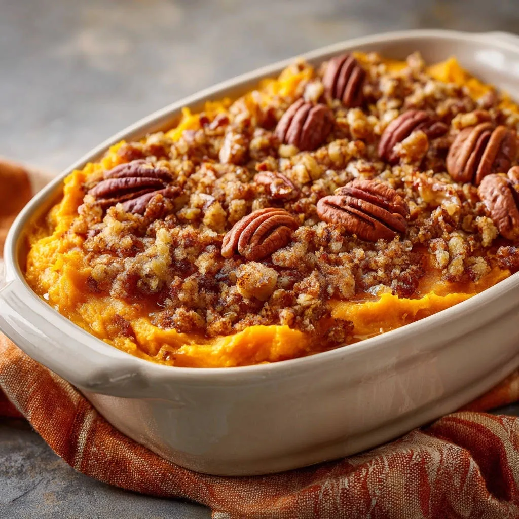 - Evenly sprinkle the prepared crumble topping over the mashed sweet potatoes in the baking dish. Arrange the 1/2 cup whole pecans on top of the crumble.