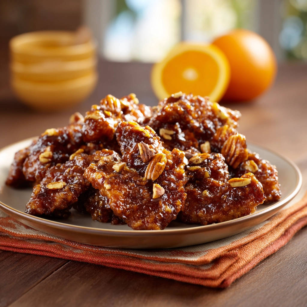 - Transfer the glazed chicken to a serving plate. Sprinkle with chopped pecans or walnuts and garnish with fresh orange slices. Serve immediately and enjoy that perfect crispy texture under the sticky glaze!