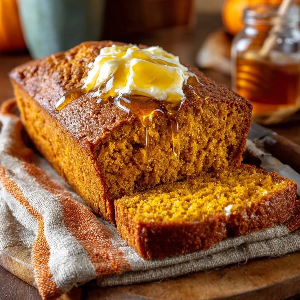 Foolproof pumpkin bread with a light, tender crumb using a gentle stir-in method. Topped with melty honey butter for the perfect fall loaf.