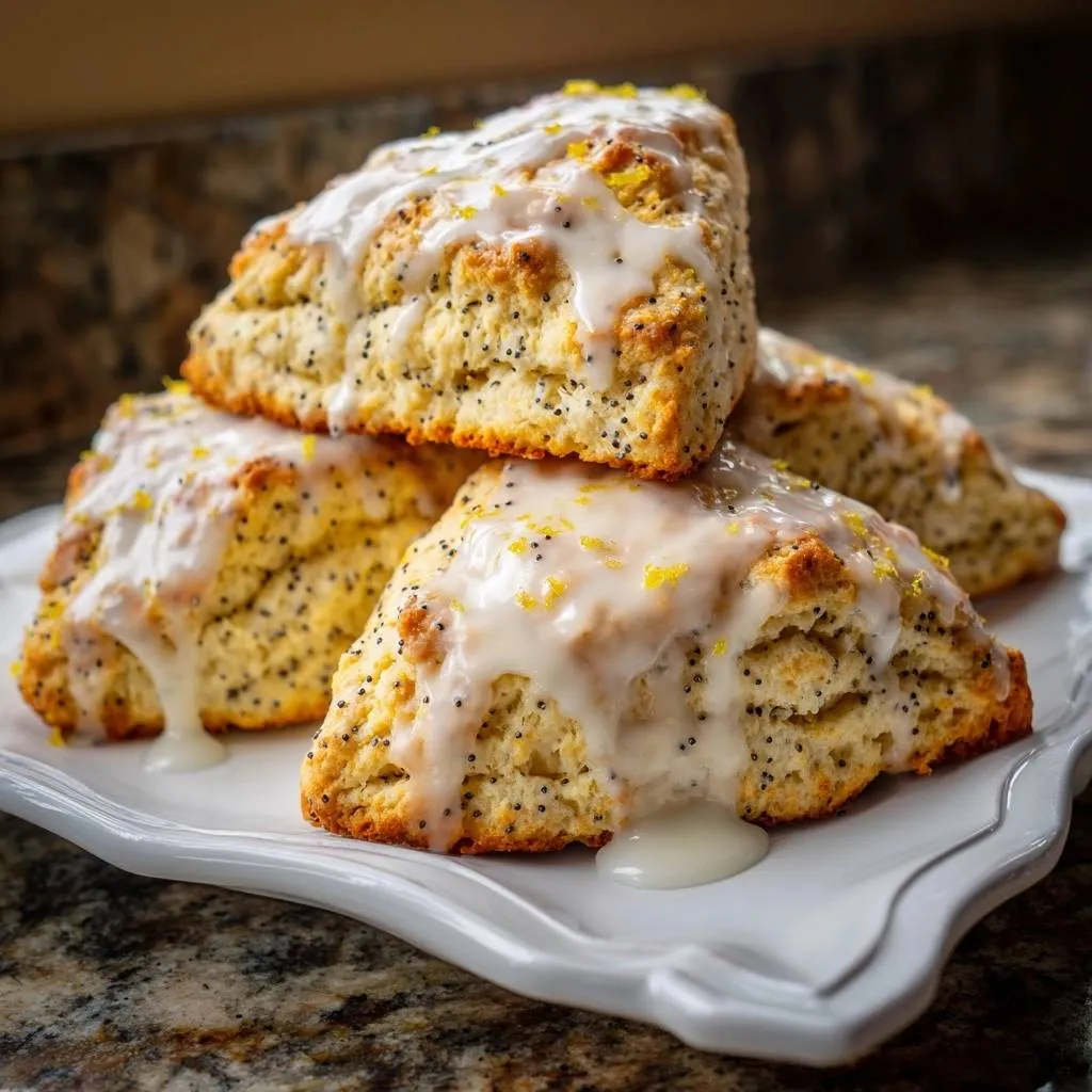 Tall, flaky lemon poppy seed scones made with a foolproof cold butter grating method for light, tender layers every time.