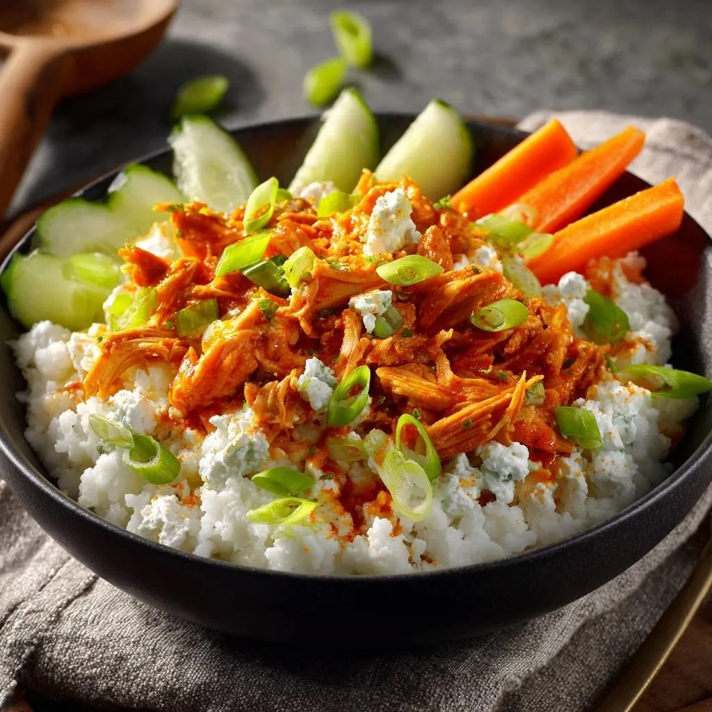 Juicy buffalo chicken over cauliflower rice with blue cheese, green onions, cucumbers, and carrots for a healthy game-day bowl.