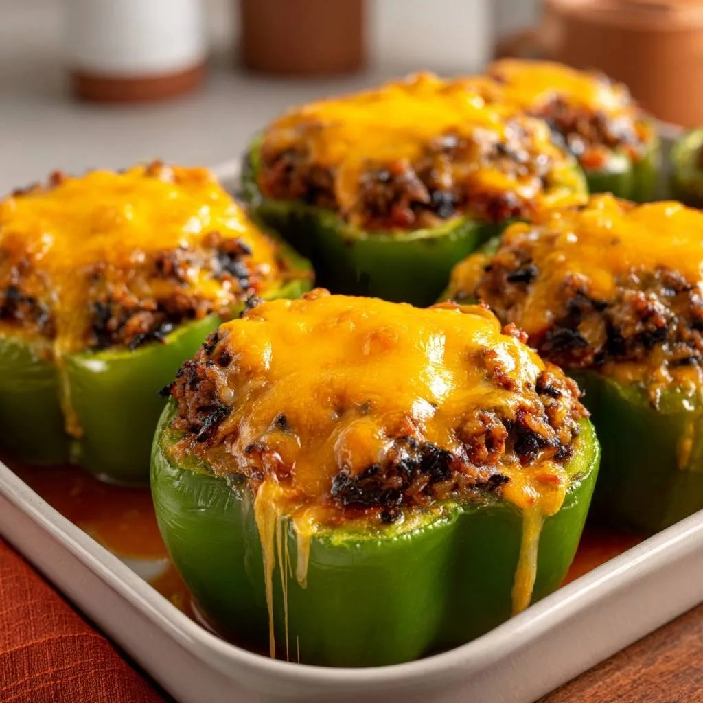 Firm, flavorful cheesy beef stuffed peppers with a salting trick to prevent sogginess. Simple recipe with ground beef, rice, and cheddar cheese.