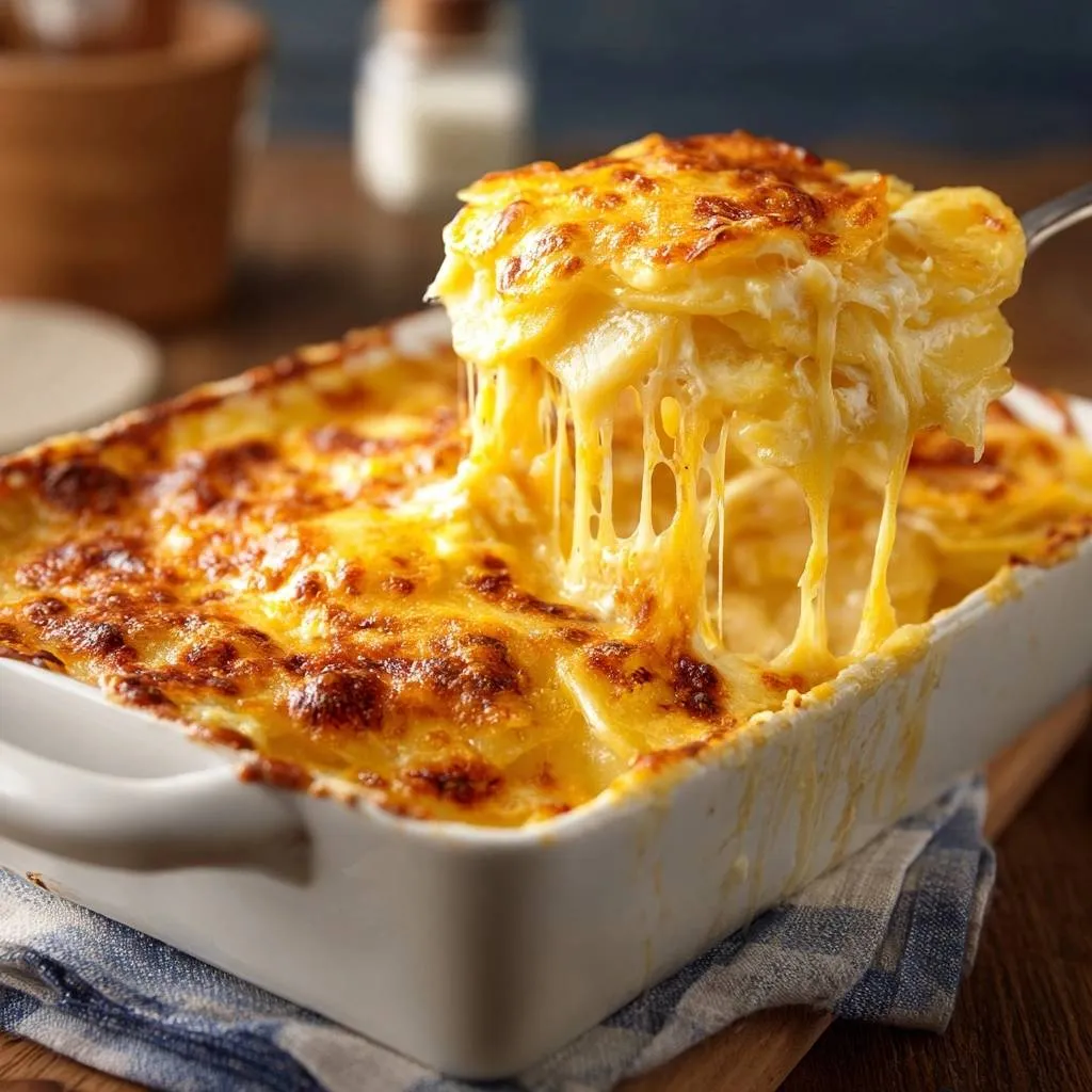 Creamy, sliceable cheesy scalloped potatoes with no watery layers. Simple trick: rinse and dry potato slices to remove excess starch for perfect results every time.