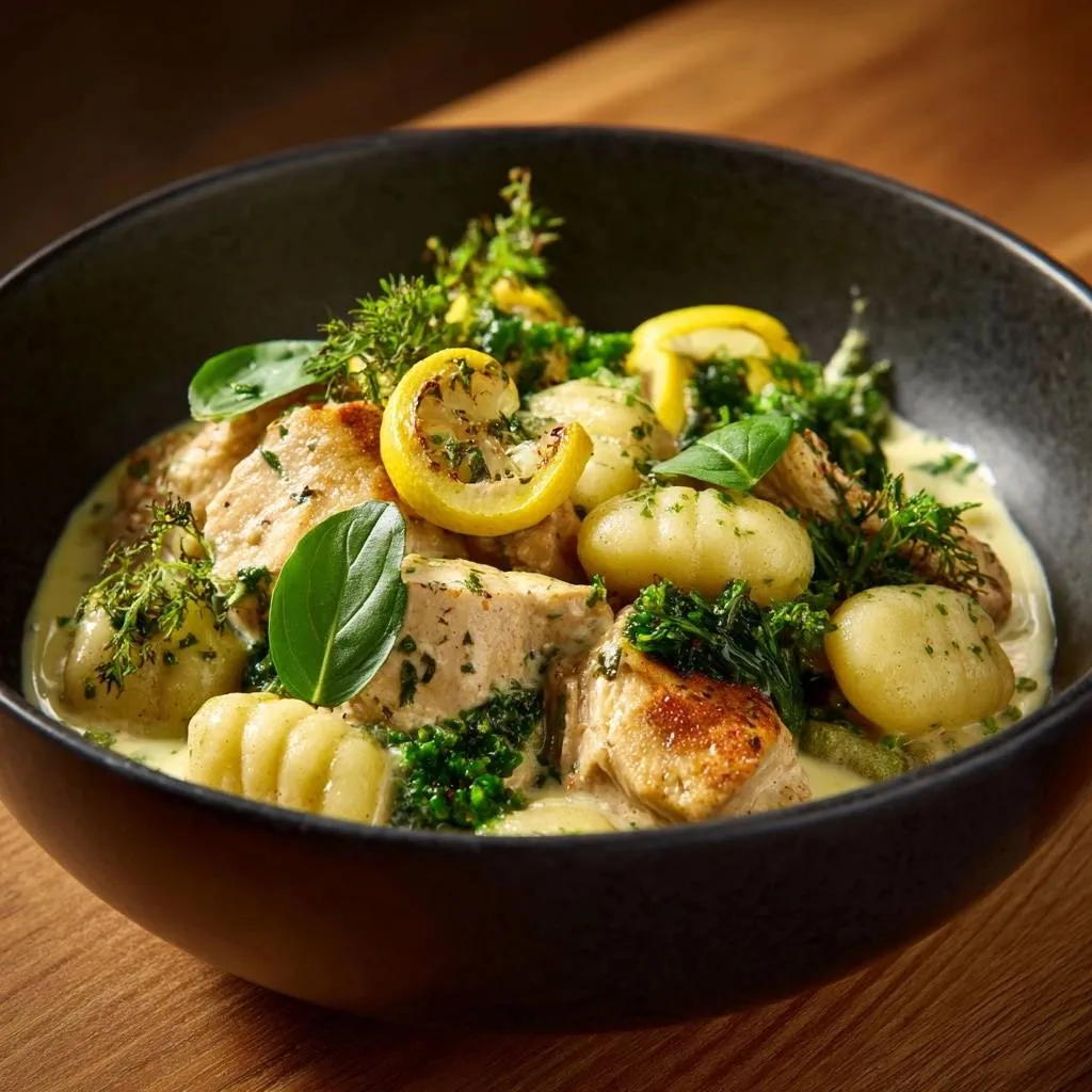 Light, pillowy gnocchi in a creamy lemon chicken sauce with rapini greens, fresh dill, and basil. No more gummy gnocchi with our perfect boil-and-finish method.