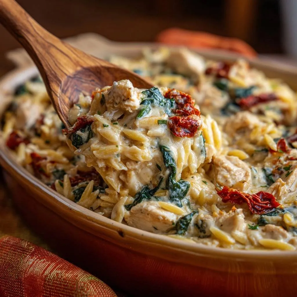 Creamy chicken orzo bake with spinach and sun-dried tomatoes that stays moist and delicious, thanks to a foolproof pasta water method. Perfect for family dinners.
