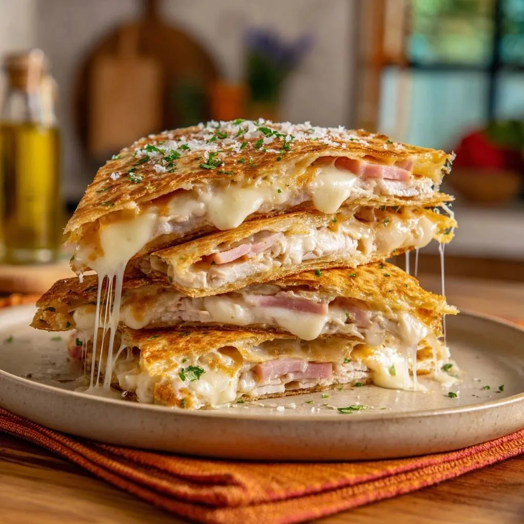 Crispy chicken ham quesadillas with mozzarella and parmesan, using a hot skillet technique for golden, non-soggy tortillas every time.