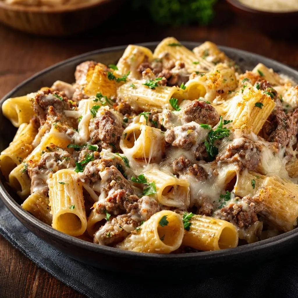 Perfect al dente cheesy beef rigatoni bake with crispy top and foolproof method to avoid soggy pasta.